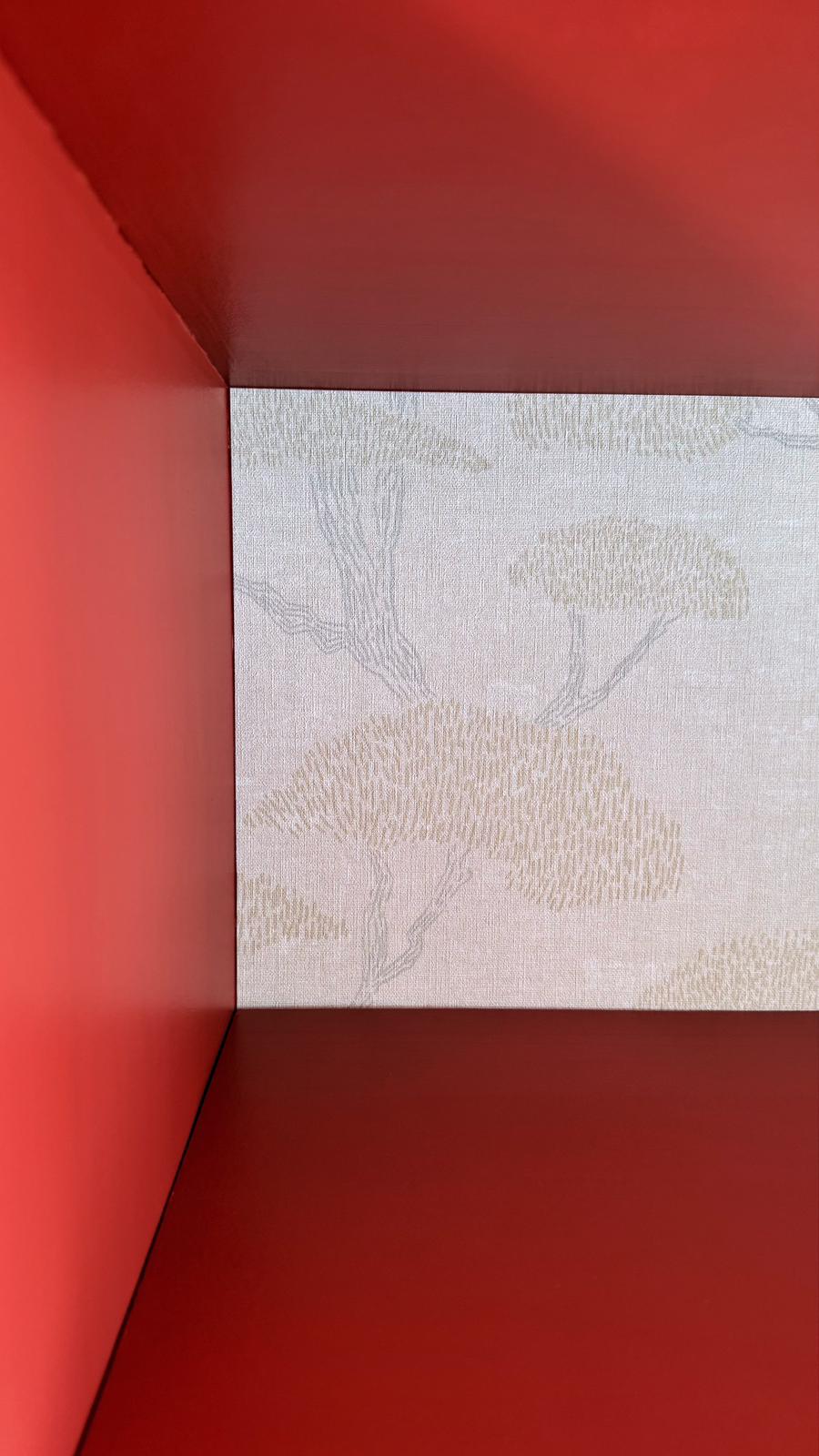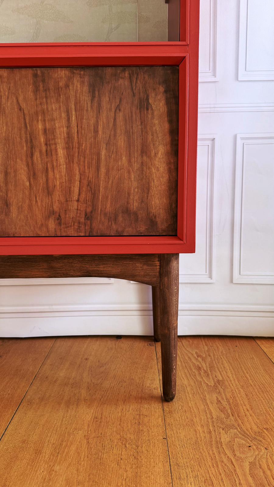 Die Türfronten aus Nussbaumfurnier sind palisanderfarben lasiert und verleihen dem Möbelstück dadurch eine elegante Tiefe und eine hochwertige Oberfläche. Auch die massiven Beine aus Buchenholz, ebenfalls in Palisander lasiert, unterstreichen den exklusiven Look. Im oberen Bereich befindet sich ein weiterer Blickfang mit einer hochwertigen aber dezenten Vliestapete auf der Rückwand und klaren Glas-Schiebetüren, vollkommen frei von Kratzern oder Beschädigungen – perfekt, um Geschirr, Deko oder Lieblingsstücke stilvoll zu präsentieren.