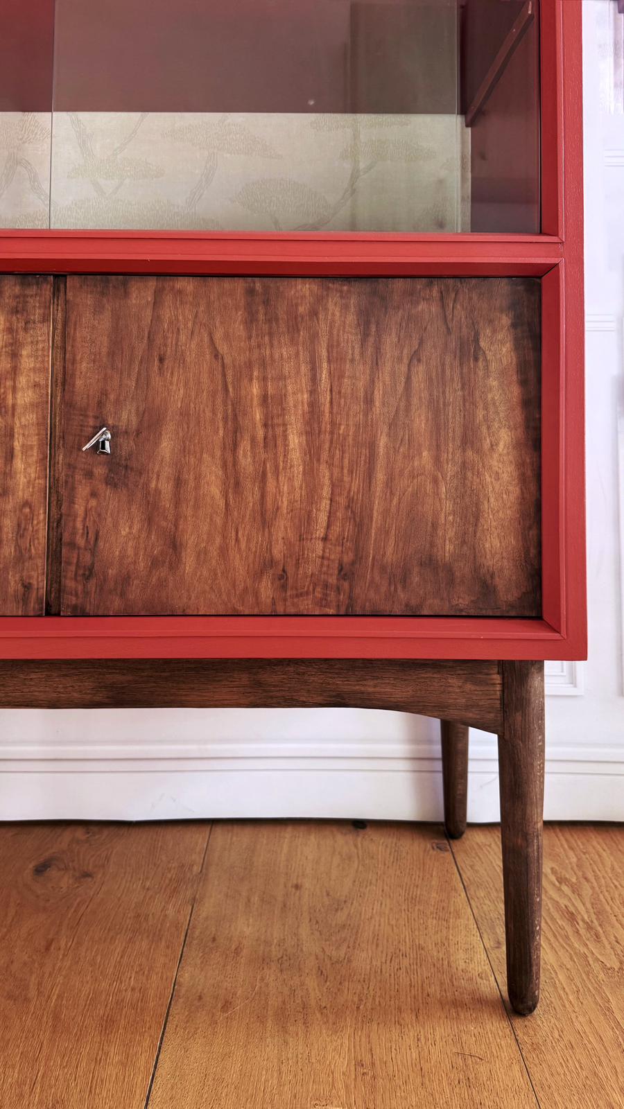 Diese einzigartige Mid-Century Vitrine ist ein echtes Unikat Möbel aus dem Hause SO SCHÖN NEU, das Design- und Interieur-Liebhaber hochwertiger Vintage-Stücke gleichermaßen zu schätzen wissen. Der Korpus ist in einem charakteristischen Orange-Kupfer-Ton neu gestaltet – modern, warm und absolut einzigartig. Alle Teile sind original erhalten, sorgfältig gereinigt und aufpoliert, sodass die Vitrine ihren authentischen Mid-Century-Charme vollständig bewahrt.